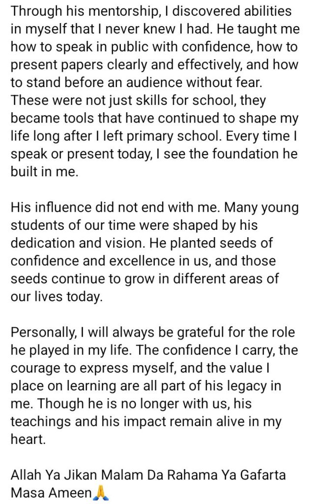 “Though he is no longer with us, his teachings and his impact remain alive in my heart.Allah Ya Jikan Malam Da Rahama Ya Gafarta Masa Ameen.”