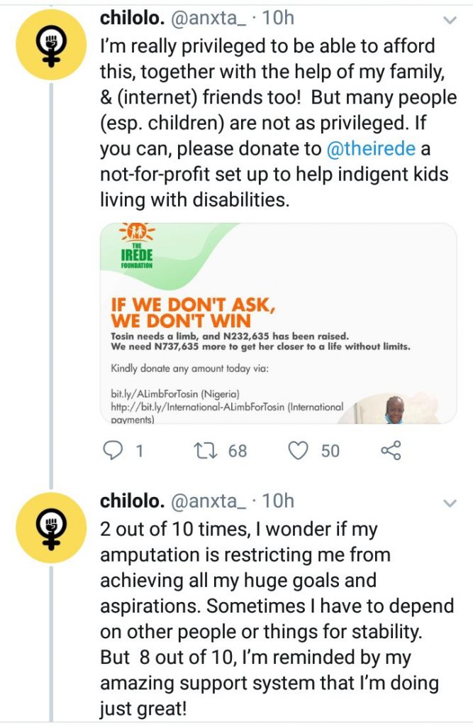 The Twitter user said she was involved in a road accident exactly five years ago. The accident resulted in one of her legs being amputated.