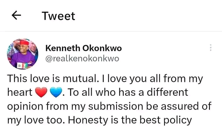 “This love is mutual. I love you all from my heart ❤️ 💙. To all who has a different opinion from my submission be assured of my love too. Honesty is the best policy”