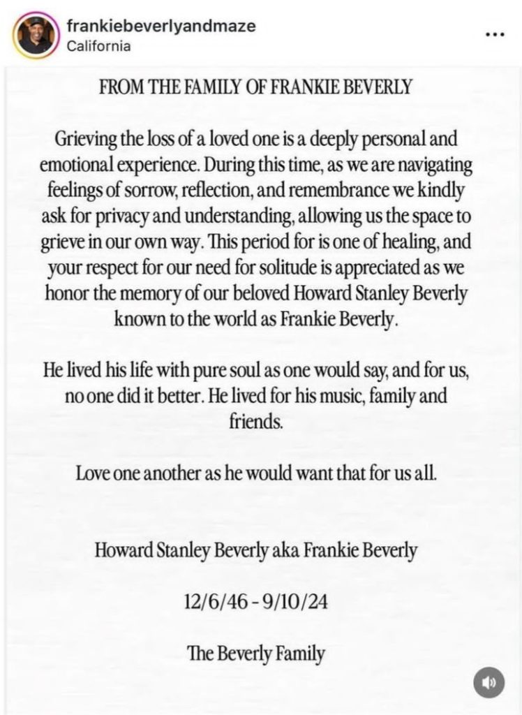 “This period for is one of healing, and your respect for our need for solitude is appreciated as we honour the memory of our beloved Howard Stanley Beverly known to the world as Frankie Beverly.”