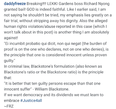 Richard Nyong was arrested on March 11 for the collapse of the five storey building in Lekki that killed about 35 people. Chief Superintendent of Police Mr. Eno-Edobor Thomas had requested that Nyong remained in jail while investigations were concluded but a Magistrate court in Ebute Metta granted him bail. OAP Freeze also confirmed his release. Read what he wrote after the cut..