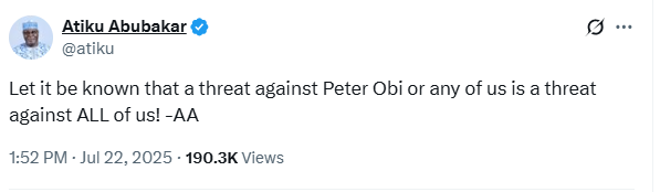 ‘’Let it be known that a threat against Peter Obi or any of us is a threat against ALL of us! -AA”