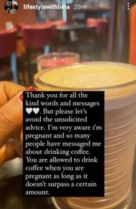 “Thank you for all the kind words and messages. But please let’s avoid the unsolicited advice. I’m aware I am pregnant and so many people have messaged me about drinking coffee,” she wrote.