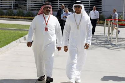 Hamilton with the president of Bahrain Motor Federation, Sheikh Abdulla bin Isa Al Khalifa,