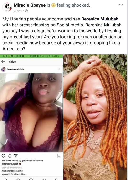 “My Liberian people your come and see Berenice Mulubah with her breast fleshing on Social media. Berenice Mulubah you say I was a disgraceful woman to the world by fleshing my breast? Are you looking for man or attention on social media now because of your views is dropping like a Africa rain?