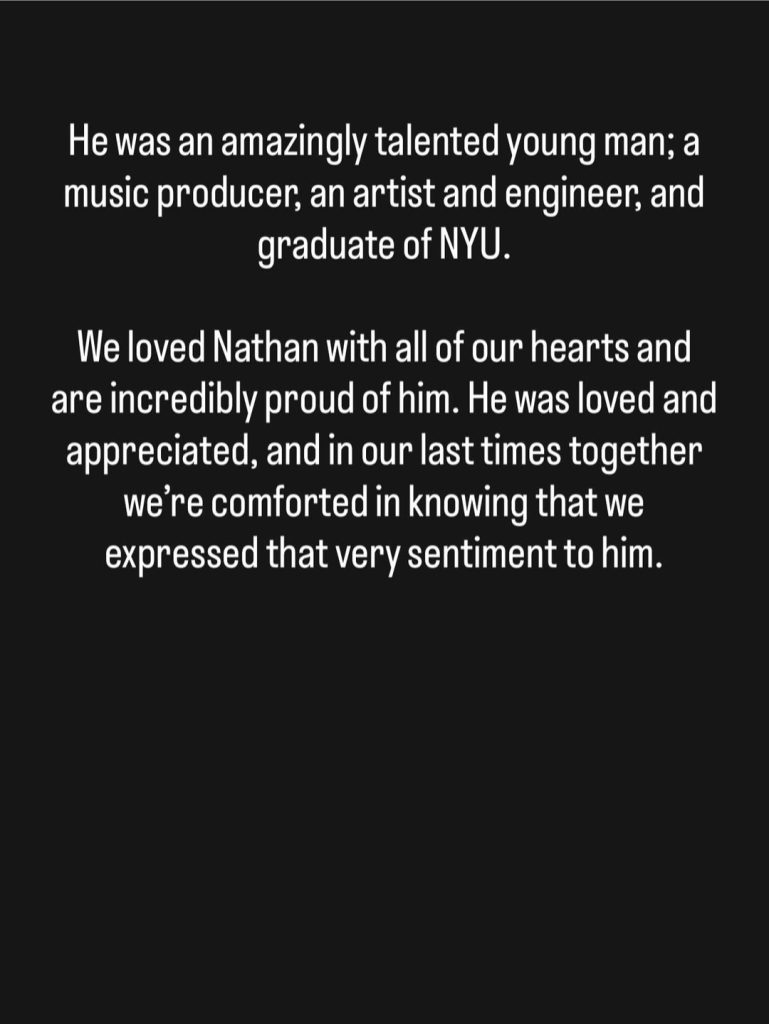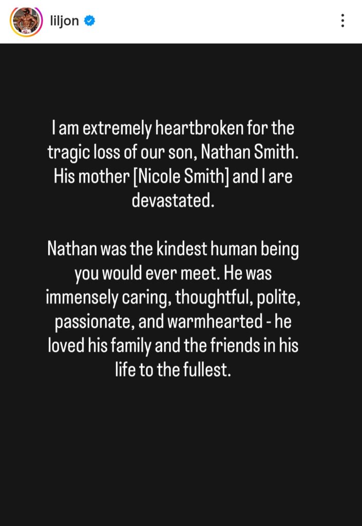 “His mother (Nicole Smith) and I are devastated. Nathan was the kindest human being you would ever meet. He was immensely caring, thoughtful, polite, passionate, and warmhearted—he loved his family and the friends in his life to the fullest,” he wrote.