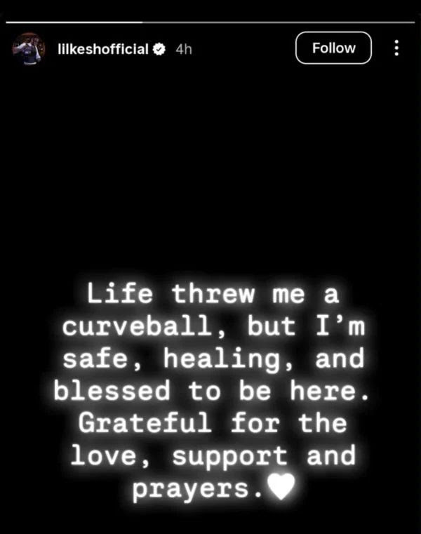 “Life threw me a curveball, but I’m safe, healing, and blessed to be here. Grateful for the love, support and prayers,” he wrote.