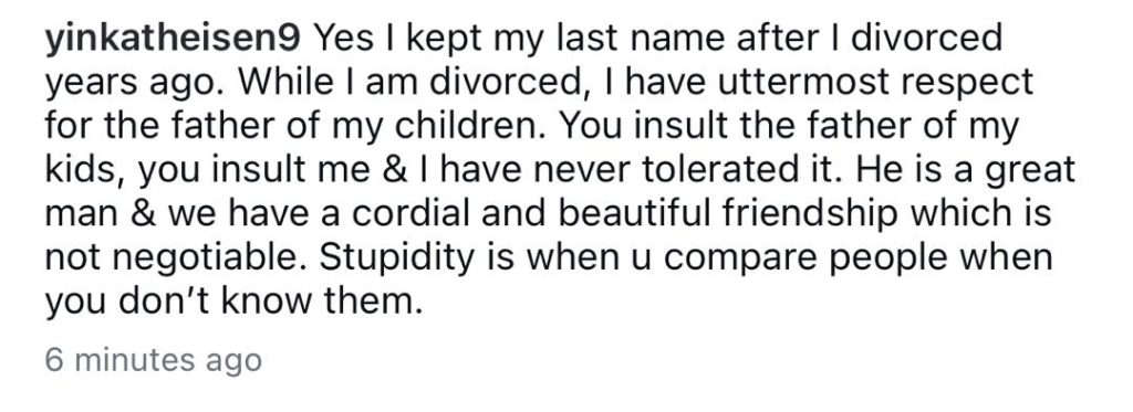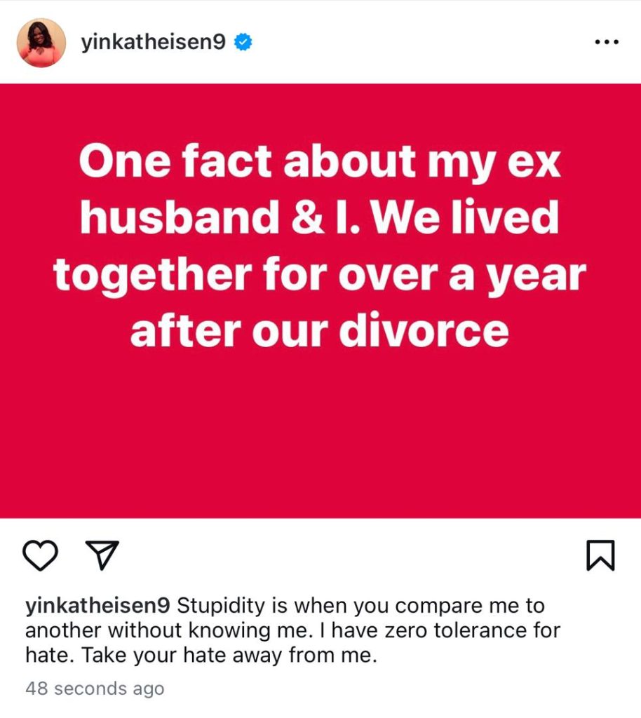 Taking to her Instagram page this morning, Yinka shared a photo of herself and her ex-husband, stating that though they have been divorced for years now, she kept his name. She disclosed that they lived together for a year after they finalized their divorce and still have a great relationship.