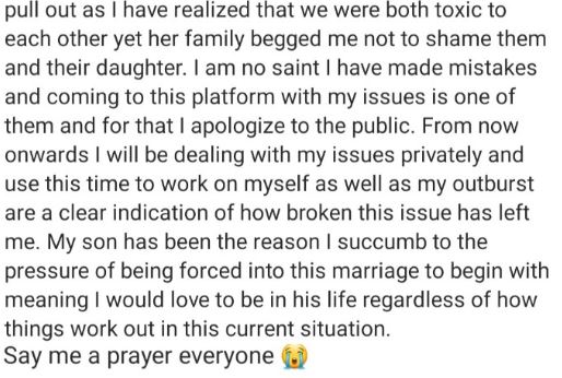 “I am no saint I have made mistakes and coming to this platform with my issues is one of them and for that I apologize to the public. From now onwards I will be dealing with my issues privately and use this time to work on myself as well as my outburst are a clear indication of how broken this issue has left me.