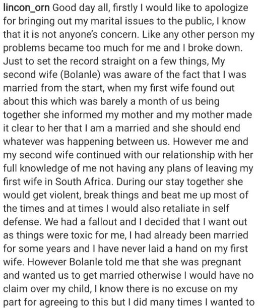 Lincon has now released a statement to address the issue, starting from the beginning of his marriage to Bolanle.