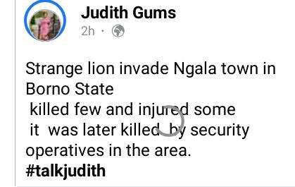 Strange lion invade Ngala town in Borno State, killed few and injured some, it was later killed by security operatives in the area.#talkjudith
