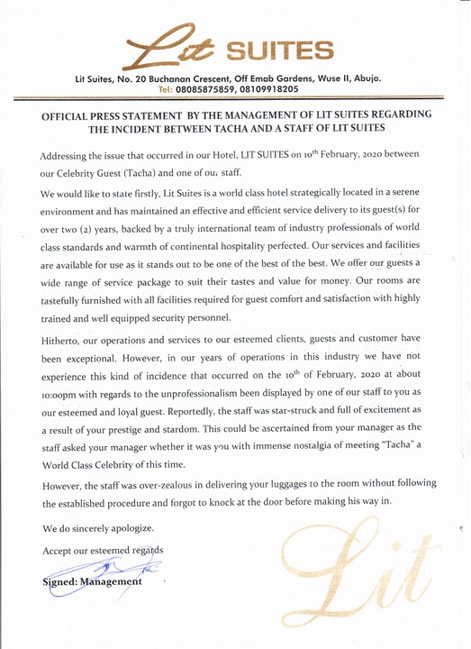 The management of Lit Suites has presented an official apology to famous Nigeria World Class Celebrity, Anita Natacha Akide, popularly called “Tacha” for the incident that occurred at her room, when one of members of staff of Lit Suites forgot to knock on her door, before entering into her room, which she condemned furiously.