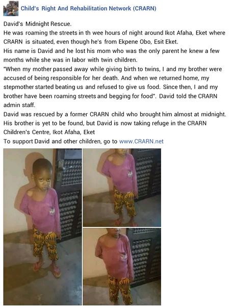 “He was roaming the streets in th wee hours of night around Ikot Afaha, Eket where CRARN is situated, even though he’s from Ekpene Obo, Esit Eket. His name is David and he lost his mom who was the only parent he knew a few months while she was in labor with twin children,” the NGO stated.