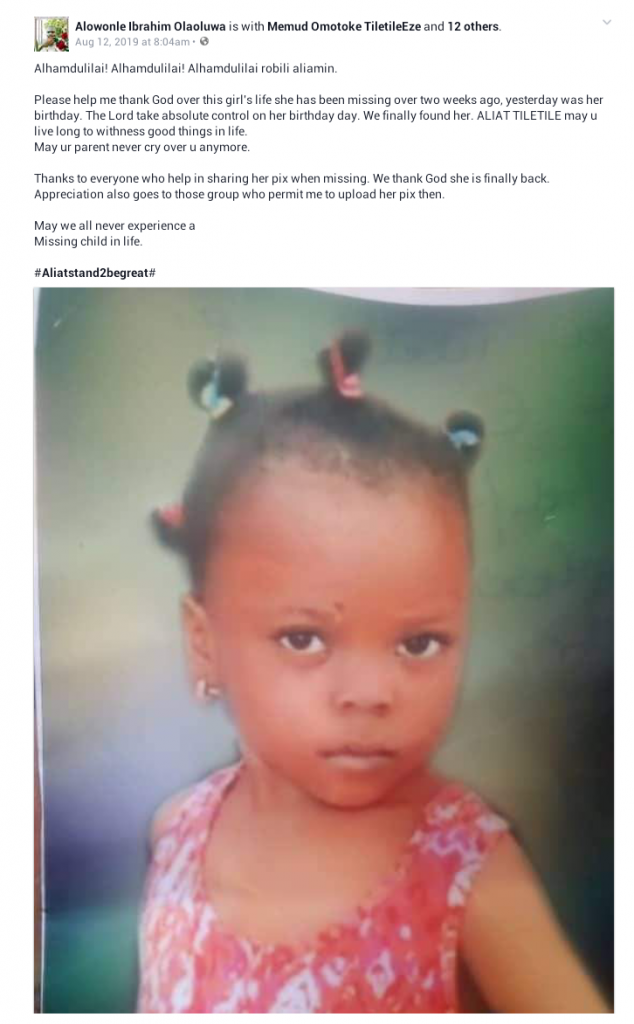 The little girl was declared missing since Thursday, August 1, in Anibaba area of Ikorodu, Lagos. See the post by a family member below.