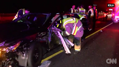 It took three firefighters to get her out and she was taken to a hospital along with four other people in the car. All have been released except for the driver who is still recovering.