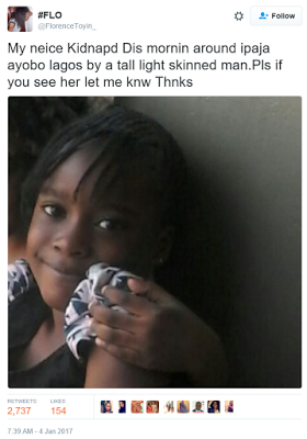 Little Olamide Kemi was kidnapped wednesday yesterday morning around Ipaja, Ayobo area of lagos by a man described as light skin.