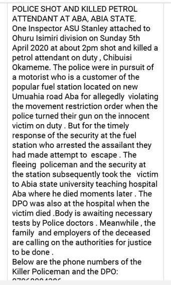 An inspector of police identified as Stanley Azu serving under Azumini Police Division in Ukwa East LGA of Abia State has reportedly killed a petrol station staff in Obingwa LGA.