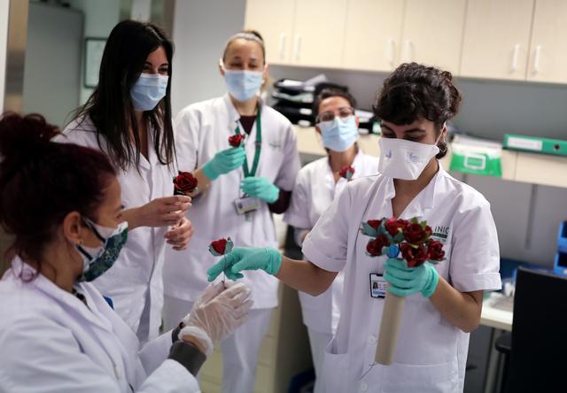 On Wednesday evening, white roses were handed to health staff at Barcelona Hospital Clinic, one of the city’s largest hospitals dealing with the coronavirus outbreak, which has killed over 22,000 people in Spain.