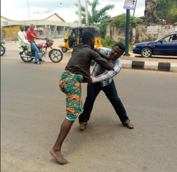 “A mad man and a pastor fighting this afternoon..the pastor insisted on delivering the mad man and it resulted to serious beating from the mad man.. pastors and wetin no concern them..according to witnesses.the pastor is fond of arranging with ppl to pretend to be mad and he will now claim healing them.. Today was a wrong day for him..”