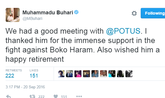 So, after president Buhari’s meeting with president Obama yesterday, he took to his Twitter handle to give details of what he discussed with Obama in a series of tweet.
