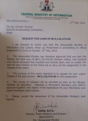 The actor posted this reply to the Minister of Information, Lai Mohammed’s N13.1m loan request from NBC to travel to China to carry ot an assignment.