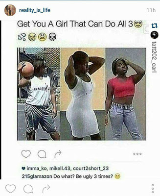 A twitter user tweeted this post with the caption:- “get you a girl that can do all three” but if you check beneath the tweet you’ll someone else’s reply in quote:- “do what? Be ugly 3 times?”