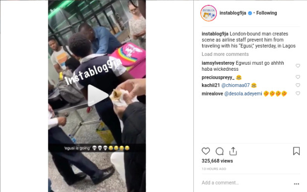 London-bound man creates scene as airline staff prevent him from traveling with his “Egusi,” yesterday, in Lagos. watch the video below: