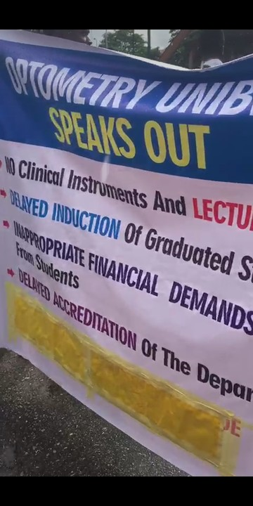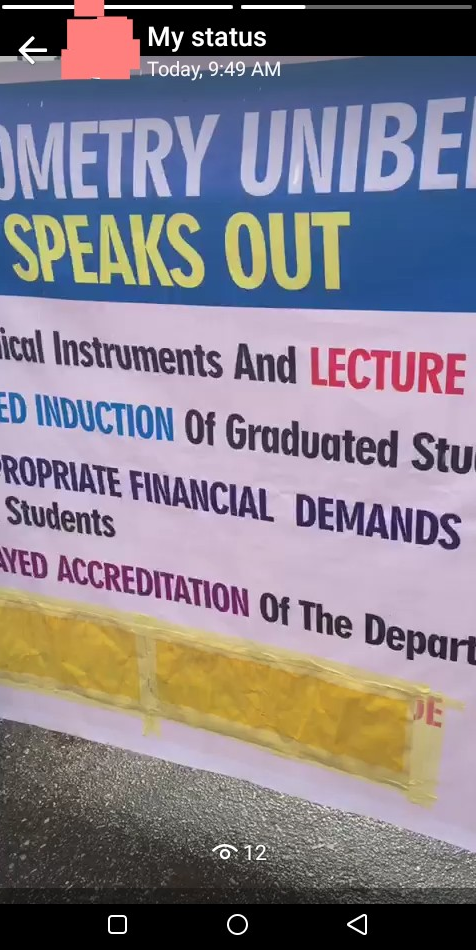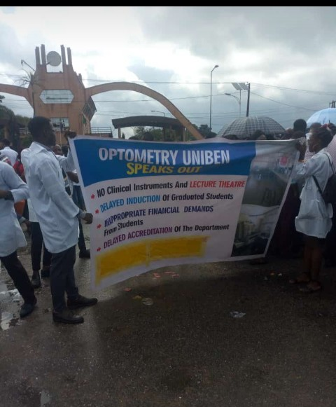 UNIBEN Optometry students converged in Mass to protest the loss of accreditation by the department and poor learning conditions. The protest started at the school main gate with the students cutting off vehiclar movement in and out of the school premises leading to a massive traffic jam….. Pics below…