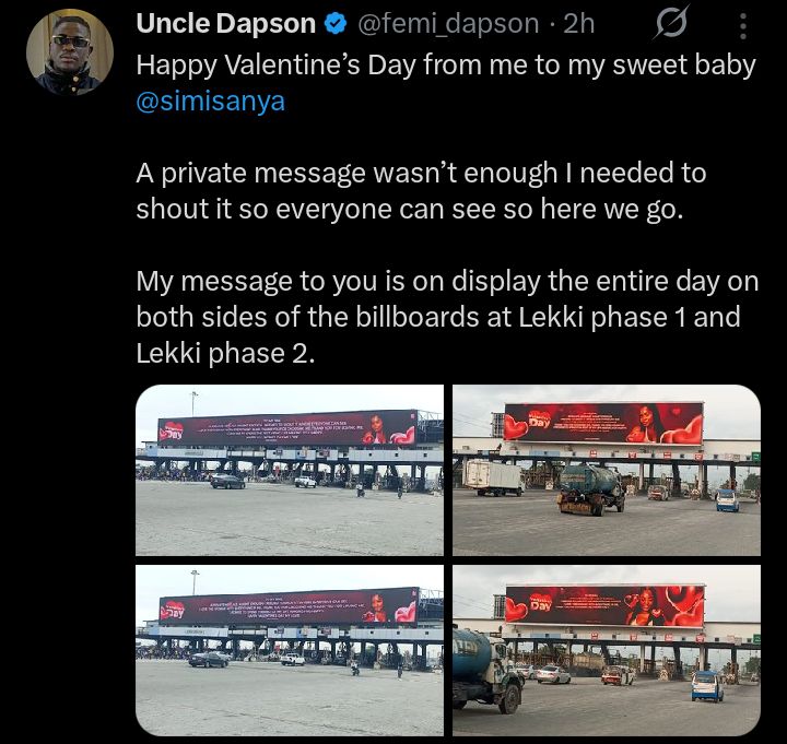 Lagos-based music video producer and Nouvelle Films founder, Femi Dapson, went all out this Valentine’s Day, surprising his fiancée, Simisanya, with a grand display of affection on massive digital billboards in Lekki Phase 1 and Phase 2.