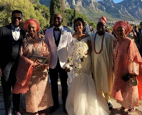 Newly wedded couple, BankyW and Adesua pose with Adesua’s brother, her mum and his parents on the right.