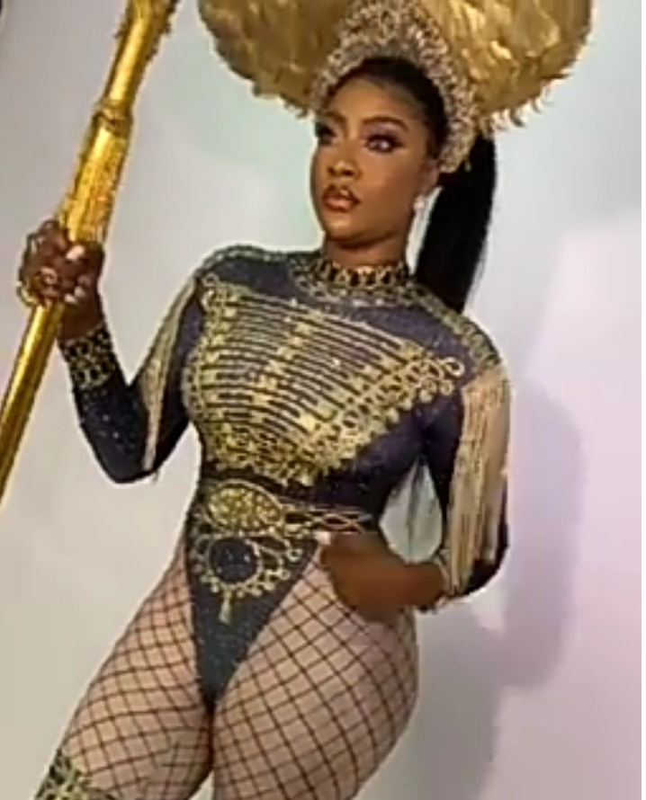 The actress showed off her curves in a bodysuit. She also held a gold sceptre and wore an elaborate gold tiara that gave her a regal look.