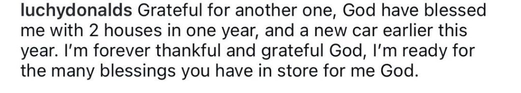‘’Grateful for another one, God have blessed me with 2 houses in one year, and a new car earlier this year. I’m forever thankful and grateful God, I’m ready for the many blessings you have in store for me God.”
