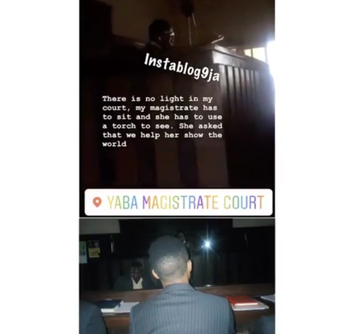 Magistrate seen using a torch due to the lack of electricity during a proceeding, yesterday, in Lagos