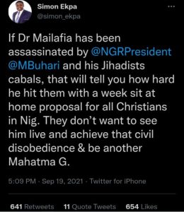 In a tweet, Ekpa wrote: “If Dr Mailafia has been assassinated by @NGRPresident @MBuhari and his Jihadists cabals, that will tell you how hard he hit them with a week sit at home proposal for all Christians in Nigeria.