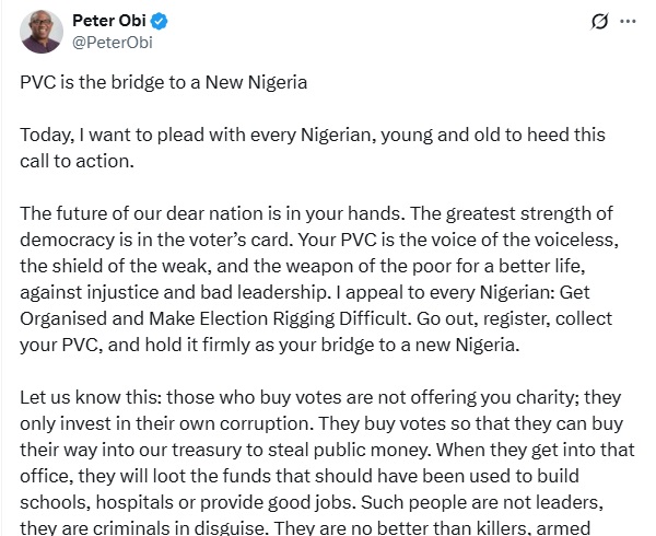 In a statement titled “PVC is the Bridge to a New Nigeria”, Obi called on citizens not to sell their votes, warning that corrupt politicians use vote-buying as an “investment in corruption.”