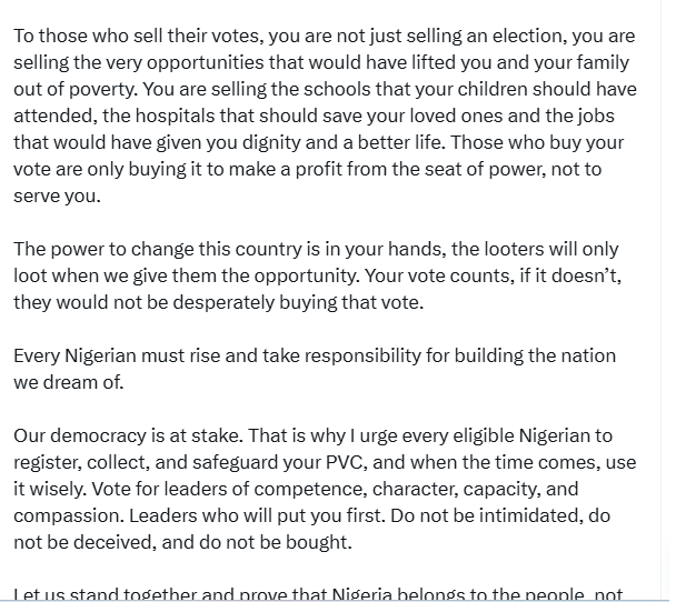 “Our democracy is at stake. That is why I urge every eligible Nigerian to register, collect, and safeguard your PVC. When the time comes, use it wisely. Vote for leaders of competence, character, capacity, and compassion. Do not be intimidated, do not be deceived, and do not be bought.”