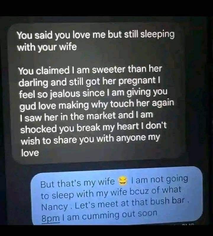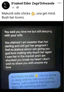 A Benue man, Elder Zege Orkwande, has shared a screenshot of a chat between a lady and her married lover in which she berated him for sleeping with his wife and getting her pregnant despite giving him ‘good love making.’