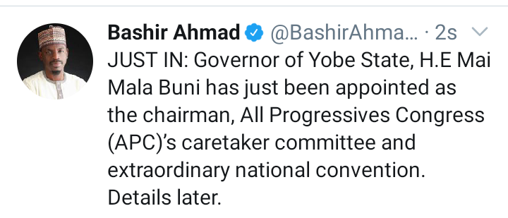JUST IN: Governor of Yobe State, H.E Mai Mala Buni has just been appointed as the chairman, All Progressives Congress (APC)’s caretaker committee and extraordinary national convention. Details later.