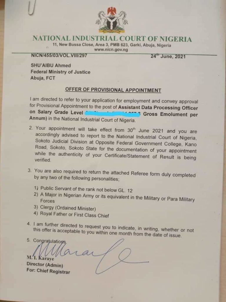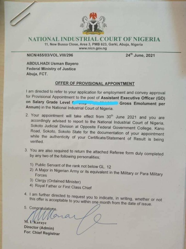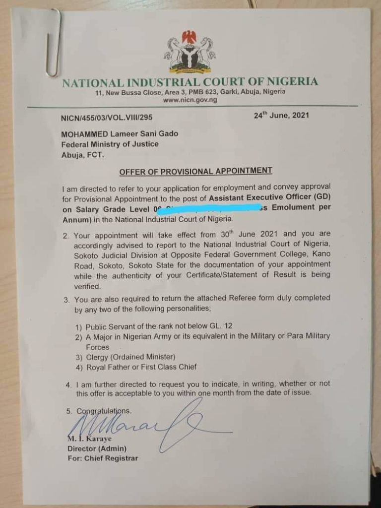 “Your appointment will take effect from 30th June 2021 and you are accordingly advised to report to the National Industrial Court of Nigeria, Sokoto Judicial Division at Opposite Federal Government College, Kano Road, Sokoto, Sokoto State for the documentation of your appointment while the authenticity of your certificate/statement of result is being verified,” the letters stated.