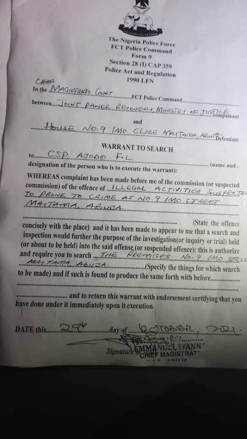 Umar had deposed on October 13 that illegal activities were going on at 9, Imo Street, Maitama which should warrant immediate action from law enforcement agents.