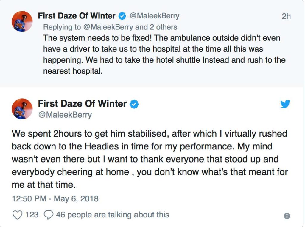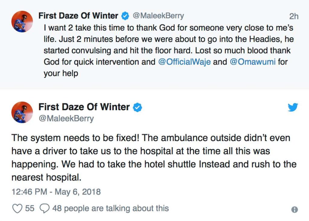 Maleek Berry took to Twitter to thank God for saving the life of his friend who convulsed at the Eko Convention Center, where the annual awards show, Headies, was being held.