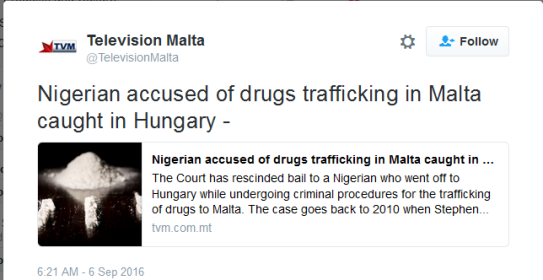 Malta Court orders re-arrest of Nigerian drug trafficking suspect who absconded to Hungary