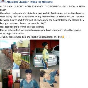 “She’s from mokopane she visited me last week in Tembisa we met on Facebook we were dating. I left her at my house as my lovely wife to be and due to trust I had over her. When I came back from work she was gone. She looted my plasma T. V, laptop money and clothes. Her name is LINKY. On Facebook she’s known as bubu vanveik. Please help me find my property anyone who have information about her please what’sapp 0765933000. R2500 cash reward help me find her exact address she live. “
