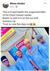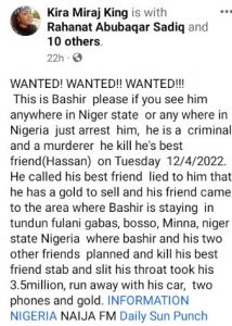 “This is Bashir please if you see him anywhere in Niger state or any where in Nigeria just arrest him, he is a criminal and a murderer he kill he’s best friend(Hassan) on Tuesday 12/4/2022. He called his best friend lied to him that he has a gold to sell and his friend came to the area where Bashir is staying in tundun fulani gabas, bosso, Minna, Niger state Nigeria where bashir and his two other friends planned and kill his best friend stab and slit his throat took his 3.5million, run away with his car, two phones and gold. May Ya Allah Forgive Your Shortcomings (Hassan)