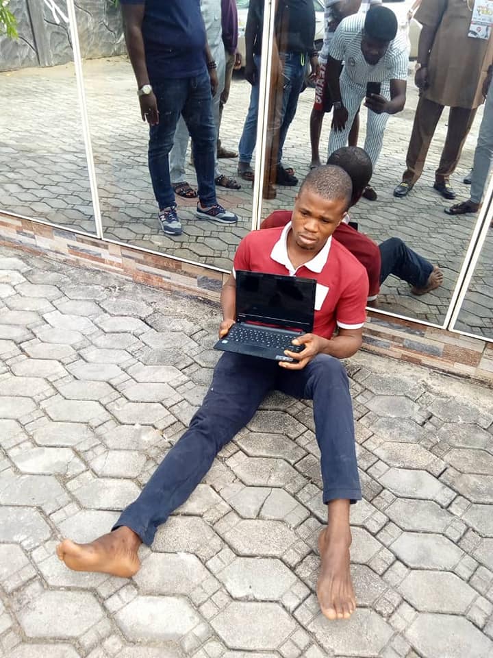 The suspect identified as Mr. Paul Ofia (sitting on the floor with a stolen laptop) who hails from Ikwo village in Ebonyi State and resides in Etegwe at the Tombia axis – was apprehended this morning with a stolen laptop worth about N150,000 which he bought for N5,000.