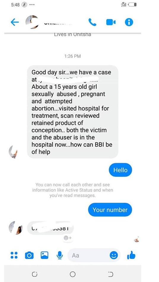Today, at 1:26pm, We received a complaint from a concerned citizen who informed us of a 15yrs old girl brought into a hospital for medical treatment. Our intelligence team led by Director General Gwamnishu Emefiena Harrison Kenneth Nwaobi Ezika Kene and others left Asaba and arrived Ogidi Anambra state for investigation.