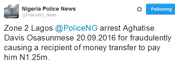 Zone 2 Lagos Division of Nigerian Police arrested a suspect identified as one Aghatise Davis Osasunmese, on September 20th for fraudulently causing a recipient of Money Transfer to pay him N1.25m.