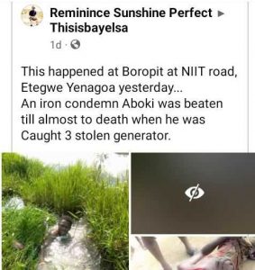 “This happened at Boropit at NIIT road, Etegwe Yenagoa yesterday. An iron condemn Aboki was beaten almost to death when he was caught with 3 stolen generators” the witness said.