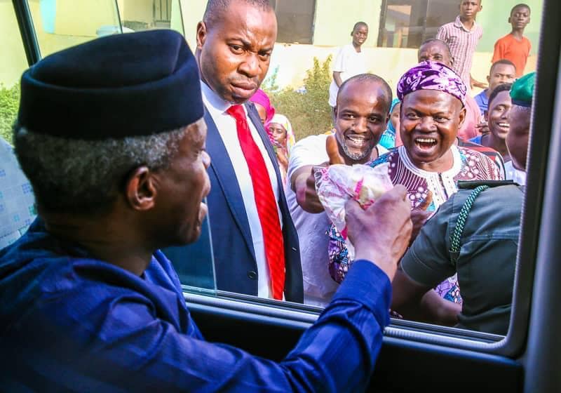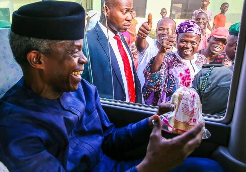 Osinbajo opened his window, gladly accepted the loaf of bread from him and prayed for him for his kind spirit.