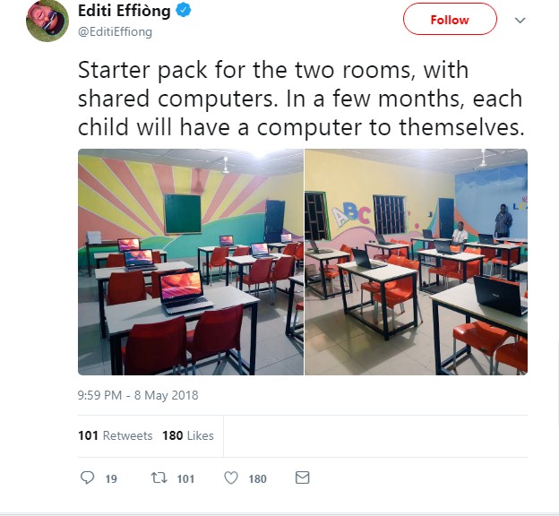 A Nigerian Man is currently melting hearts Online after returning to his former Primary School to build a Computer lab, Sharing the goodnews on his page Editi Effiong said its a promise he made last year, and each pupil gets to own one Computer each, How nice, to think that he is from Akwa Ibom..